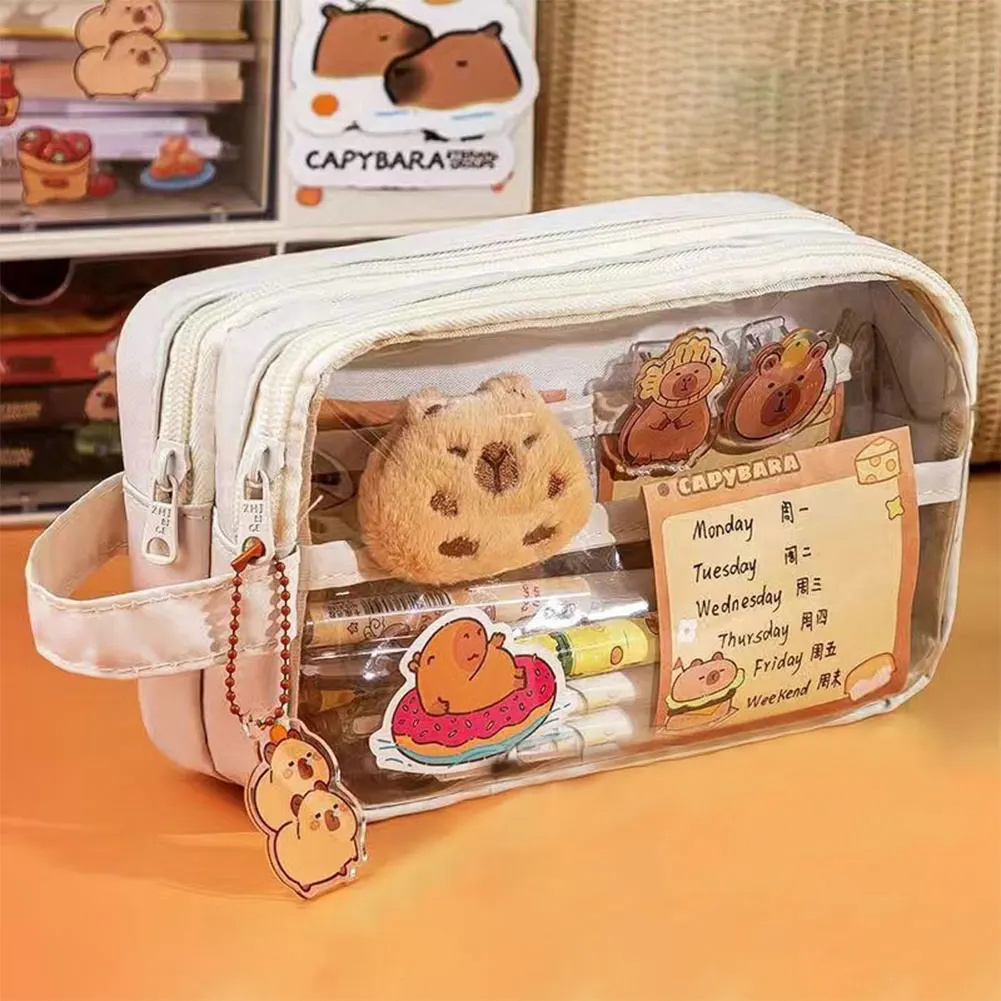 Capybara Kawaii Pencil Case with Compartments Pencil Pouch Clear Stationary Bag with Sticker Pendant for Office College School